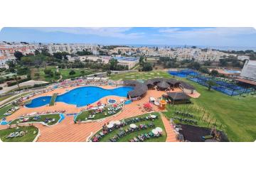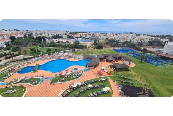 Aparthotel num Hotel bem centrado em Albufeira, cozinha equipada com electrodomésticos, o hotel está equipado com um restaurante, bar, discoteca, parques para crianças, campos de Pads, com uma grande piscina no exterior e outra no interior, ginásio, supermercado Spar, parques para crianças.